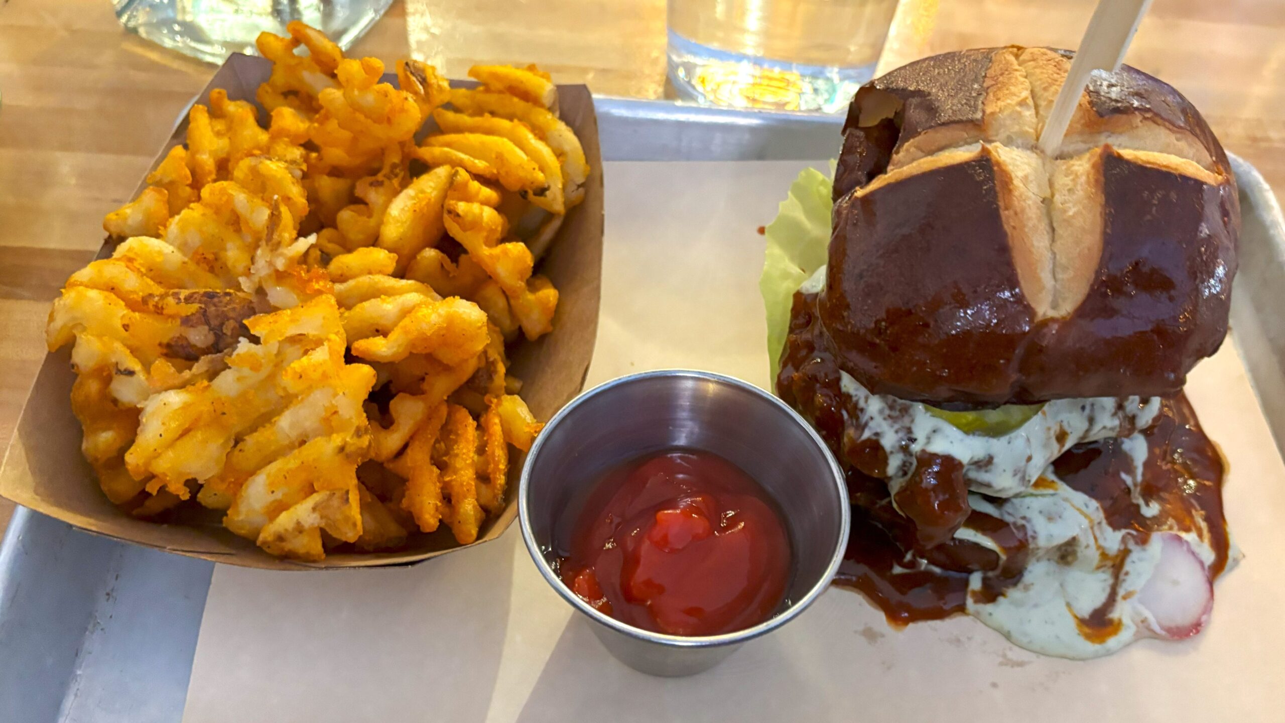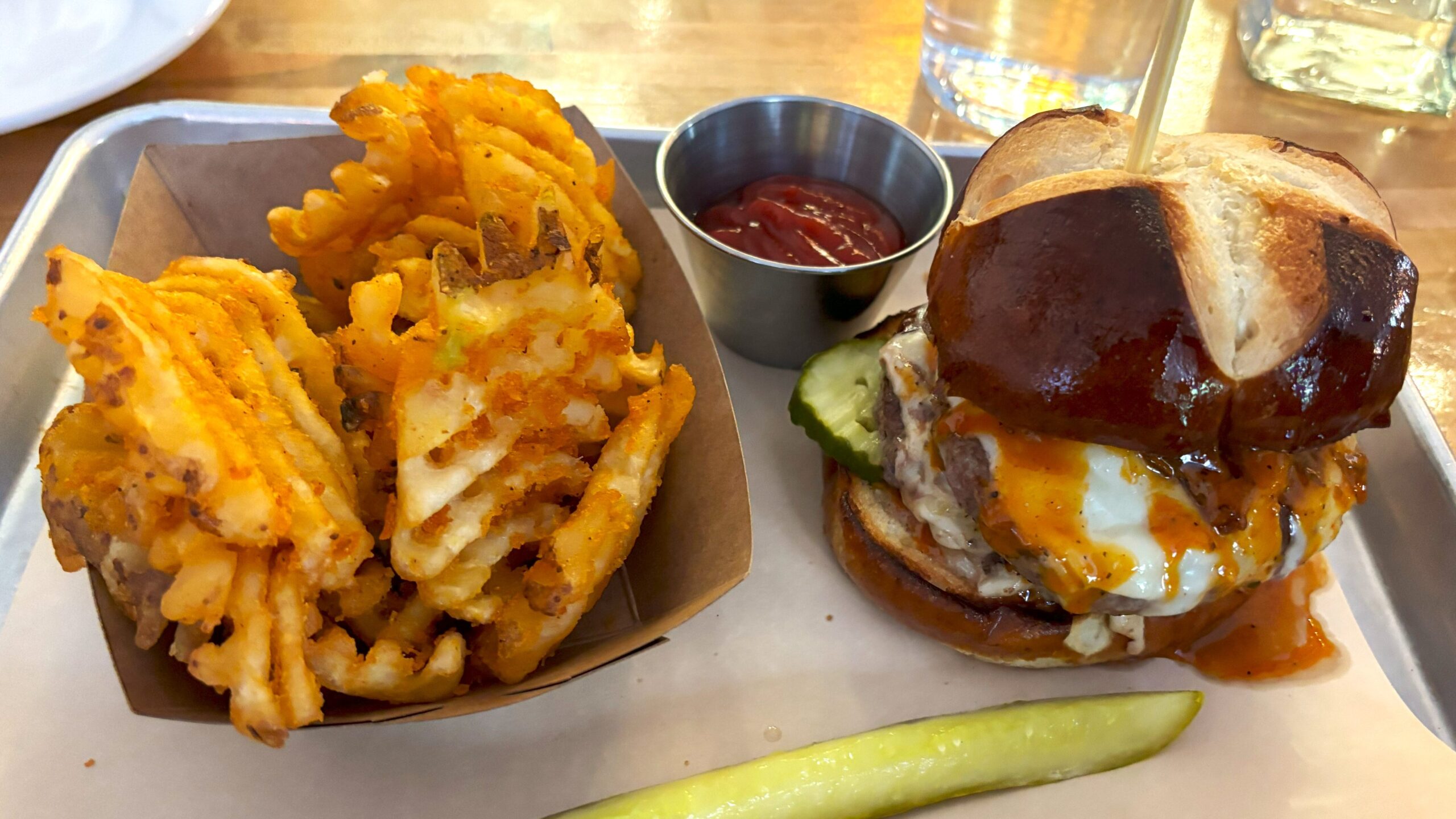 プレッツェルバンズにジューシーなビーフパティ、キャラメリゼオニオン、チーズ、ピクルス、そして主役の「エミーソース」がたっぷりと挟まっています。サクサクのワッフルフライと外付けピクルスがセットになっています。