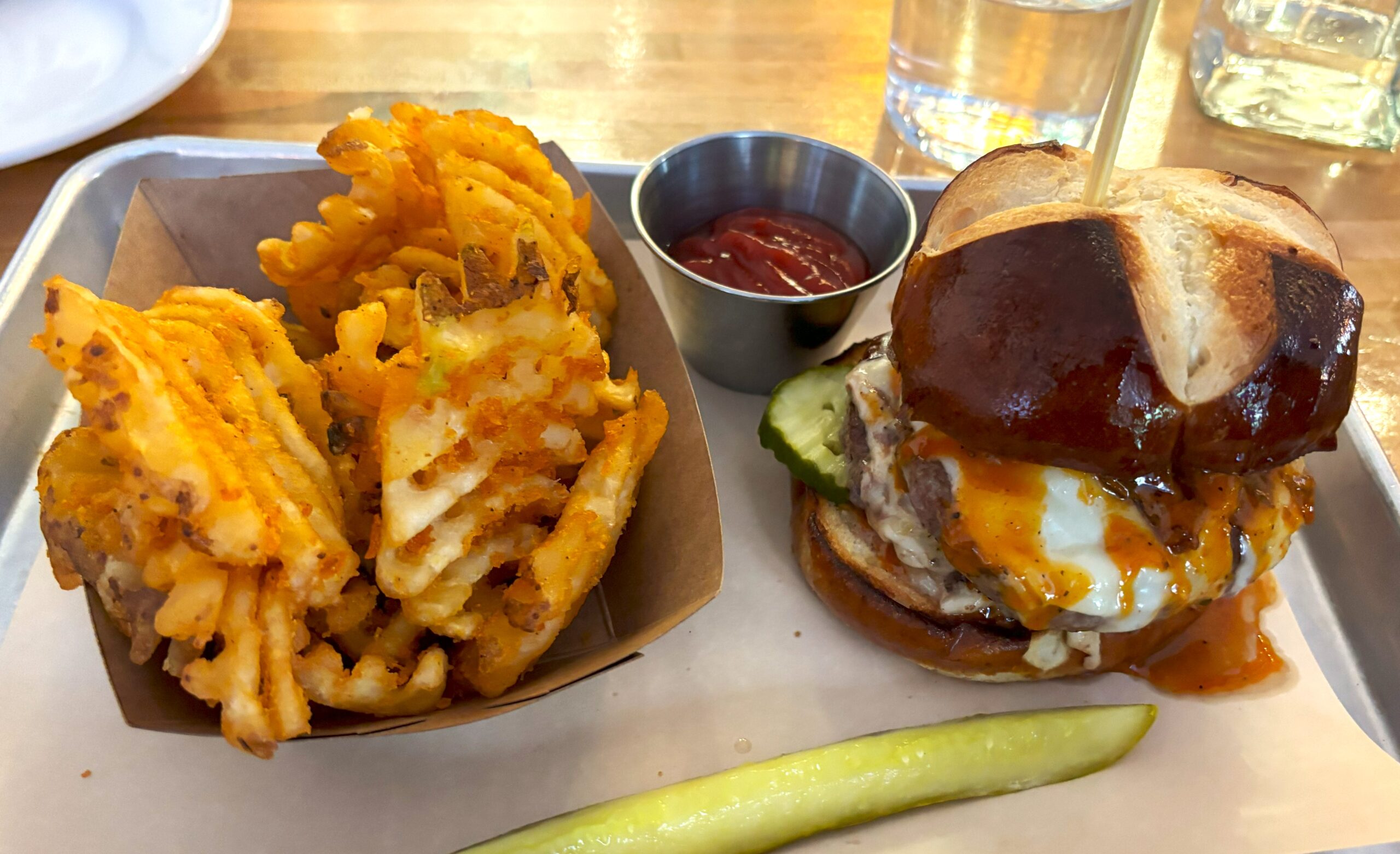 プレッツェルバンズにジューシーなビーフパティ、キャラメリゼオニオン、チーズ、ピクルス、そして主役の「エミーソース」がたっぷりと挟まっています。サクサクのワッフルフライと外付けピクルスがセットになっています。